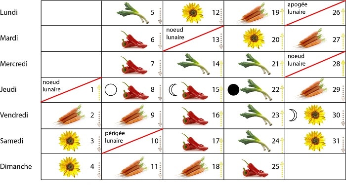 Le calendrier lunaire se base sur la position de la lune dans le ciel. Ainsi quand elle est montante, c’est le moment où la sève monte dans les branches. C’est donc le meilleur moment pour le greffage et le semis ainsi que pour les récoltes des légumes à feuilles, bref c’est la période idéale pour faire des travaux au dessus du sol. Quand la lune est descendante, c’est le moment idéal pour le repiquage et la plantation, bref pour les travaux sous terre. En effet, c’est à cette période que la sève regagne les racines. Entre la période de la nouvelle lune jusqu’à la pleine lune (lune croissante), c’est le temps des récoltes et des cueillettes des fruits et légumes. Entre la période de la pleine lune jusqu’à la nouvelle lune, c’est la période idéale pour fertiliser le sol. Lors des nœuds lunaires, il ne faut réaliser aucun travail dans le jardin.